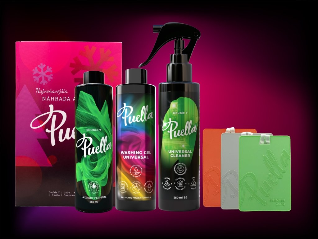 Obsahuje: Puella parfum na pranie 250 ml, Puella prací gél 250 ml, Puella univerzálny čistič 250 ml, Puella voňavé karty (1 ks Double Y, 1 ks Frayo, 1 ks Queenka)